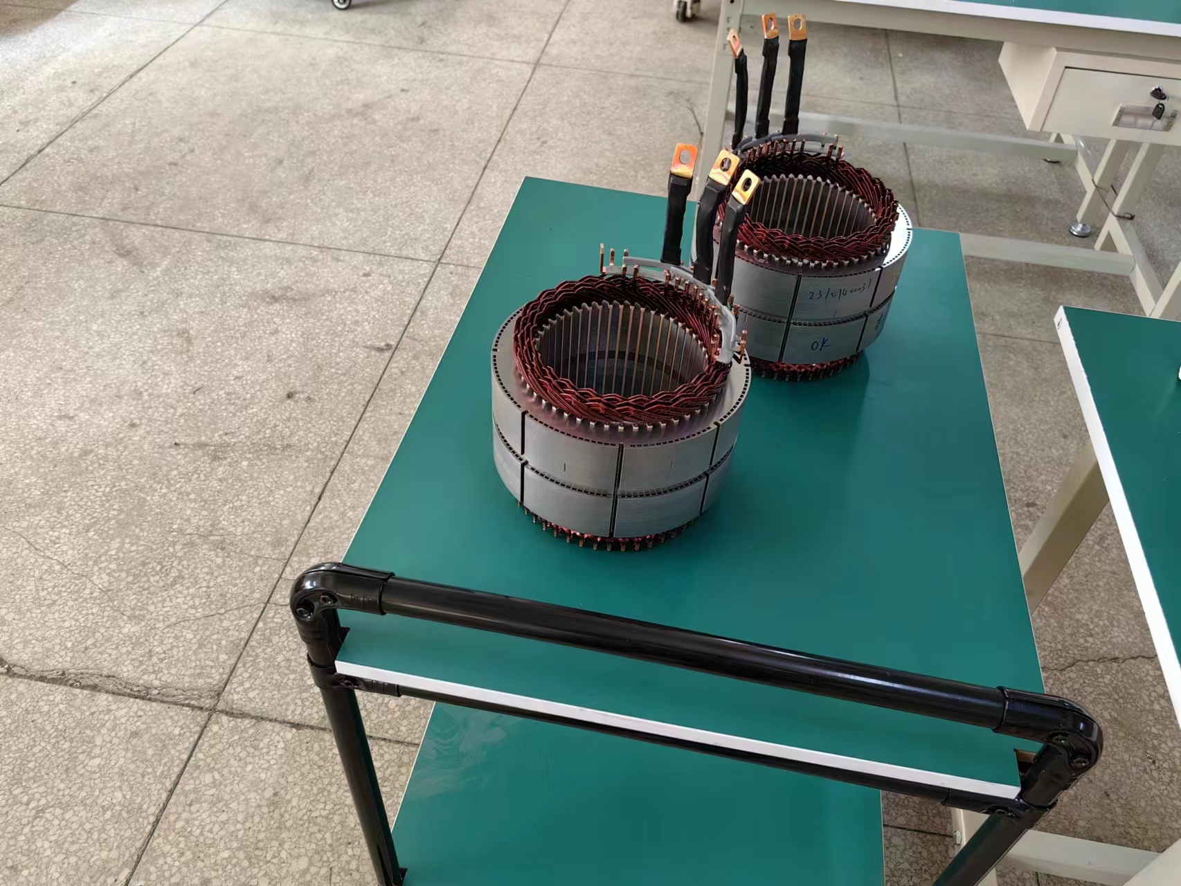 (1)鐵芯上絕緣紙(B形、S形、O型)→(2)漆包扁線下線去漆成U型→(3)異形線定長下線去漆→(4)異形線成型→(5)星點線焊接→(6)人工預(yù)插線入定子鐵芯→(7)線圈整形壓入鐵芯→(8)非出線端自動伺服扭頭并自動消除回彈角→(9)非出線端線頭自動切平→(10)非出線端自動TIG焊接→(11)三相引出線焊接。